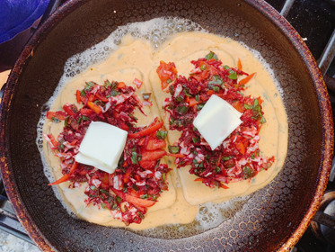 For the mixed veggie sandwich, top each slice of bread with mixed veggies, 1 tbsp butter, and drizzle with a little batter. Flip and fry on both sides evenly adding more butter, if necessary. Fold, cut into pieces and serve with mint chutney.