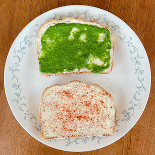 Apply coriander chutney on two of the slices evenly, on top of the butter as shown in the above picture.