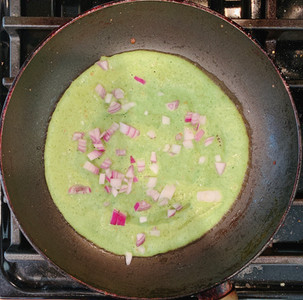 Heat a frying pan on medium heat. Spread a ladleful of batter on hot pan. Top it with finely chopped onions. Pour spoonfuls of oil around the pesarattu and also in the center. Cook both sides until golden brown.
